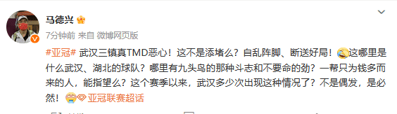 体坛周报记者马德兴发文表达对于武汉三镇的愤怒。文章中怒斥球队自乱阵脚,断送好局,质疑球队是否具备九头鸟的斗志。记者指责球队成员只是为了金钱而来,质疑球队的斗志和拼劲。文章表示,这样的情况在本赛季已经发生多次,不是偶发而是必然。